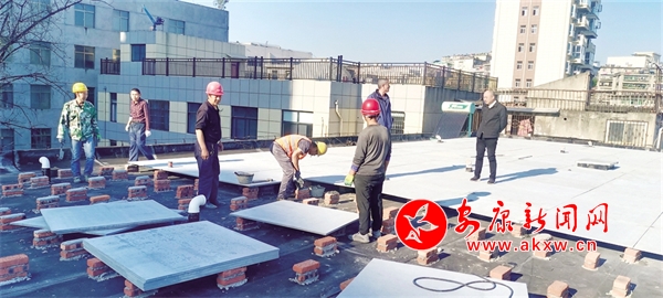 工人正在對安康日報社家屬樓房頂進行處理